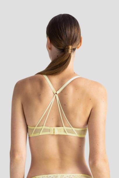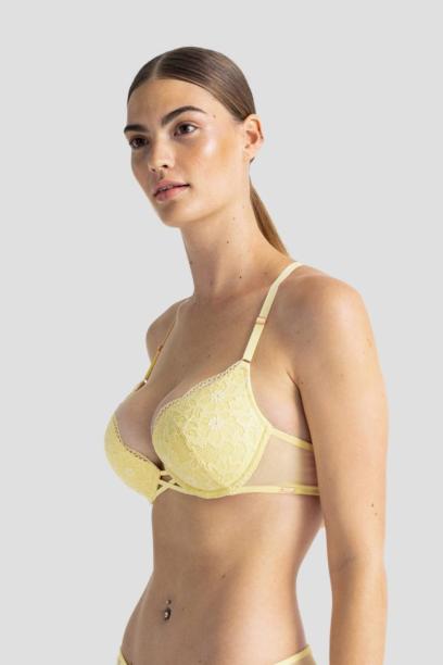 Vormitud kausiga erkkollases toonis push up rinnahoidja. Seljaosal paeltega kaunistusdetail.
