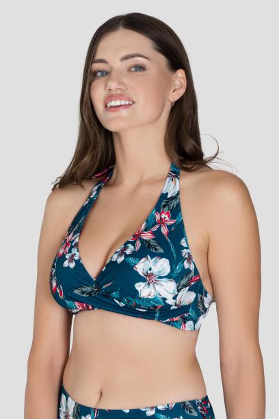 Tankini hoiab sind kaunilt kaetud. Rinnaosa on tugikaarteta ja kerge polstriga, padjad on eemaldatavad. Kaela taga on seos, seljal kinnitusklamber. Stiilse mustriga trükitud mikrokangas.