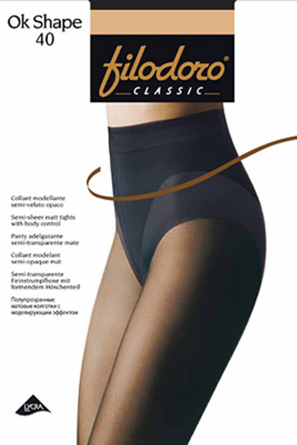 FILODORO OK SHAPE 40 . Korrigeeriva pükskorsetiga täismatt sukkpüks. Korrektsiion on suunatud kõhu osale. Topelt kaetud lükra. Ekstra lamedad õmblused. Tugevdatud varbaosa. Puuvillane vahetükk.