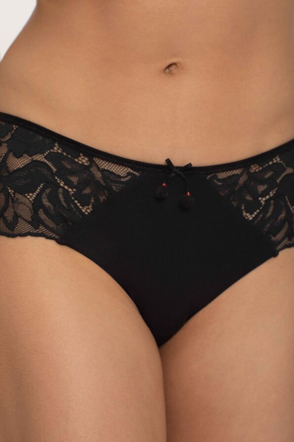 Pükste esiosa on sametise struktuurse pitsiga ja tagaosa võrgust. Kasutatud on ümbertöödeldud materjale.
