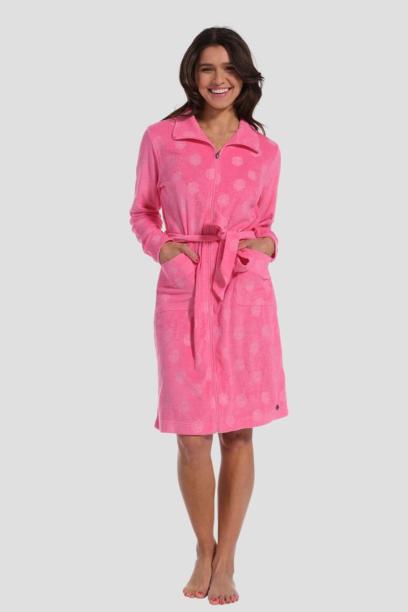 Peenest froteekangast rõõmsavärviline lukuga hommikumantel. Sobib kanda ka lihtsalt igapäevase kodukleidina.