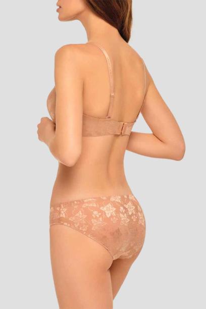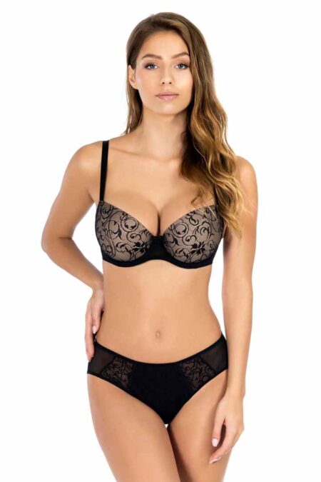 Veidi kõrgendatud pihaga püksid. Eesmine sile materjal muutub külgedel sujuvalt pitsiliseks. Pükste tagaosa on sile, served on viimistletud õrna võrguga, tänu millele aluspesu rõivaste all silma ei paista.