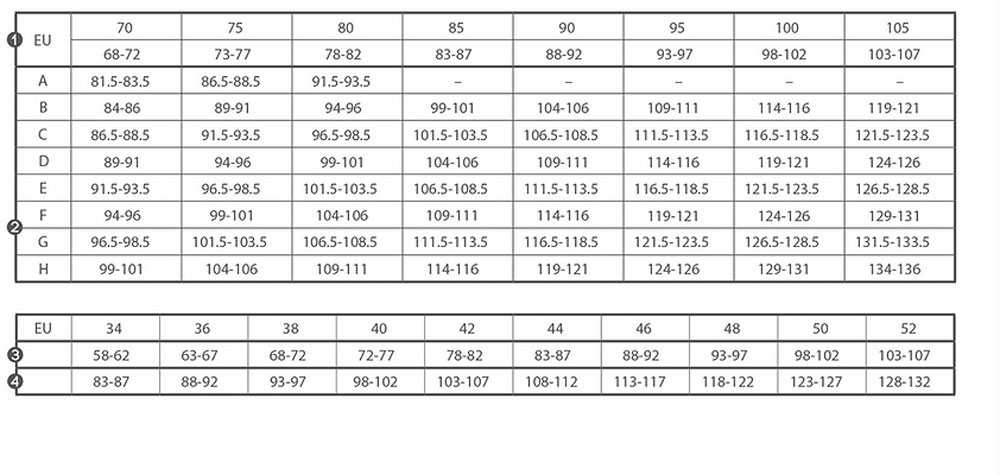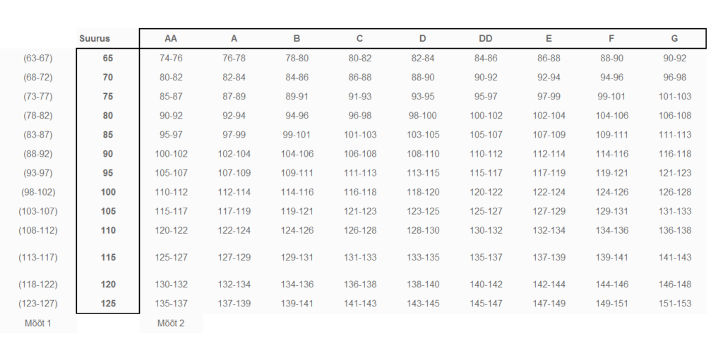 Sinu rinnahoidja suurus sõltub rinnaalusest ümbermõõdust ja rinnapealsest ümbermõõdust (täidlusest). Allolev süsteem aitab Sul õiget suurust teada. Mõõtmisel on parem abi paluda, ning olemasolev rinnahoidja selga jätta.