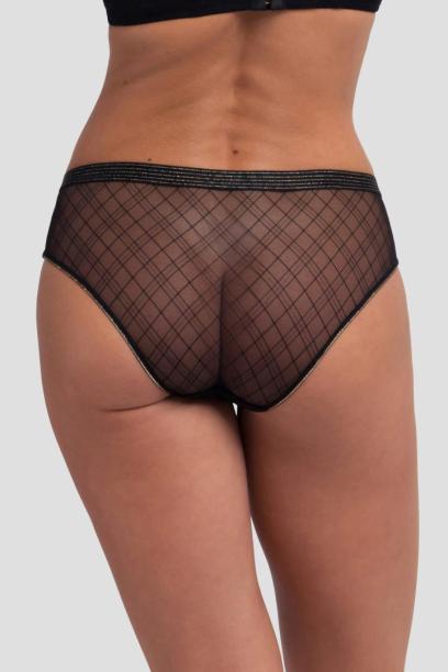 Madala joonega püksikud, esiosa on pitsi ja triibulise võrguga, tagaosa on võrgust.